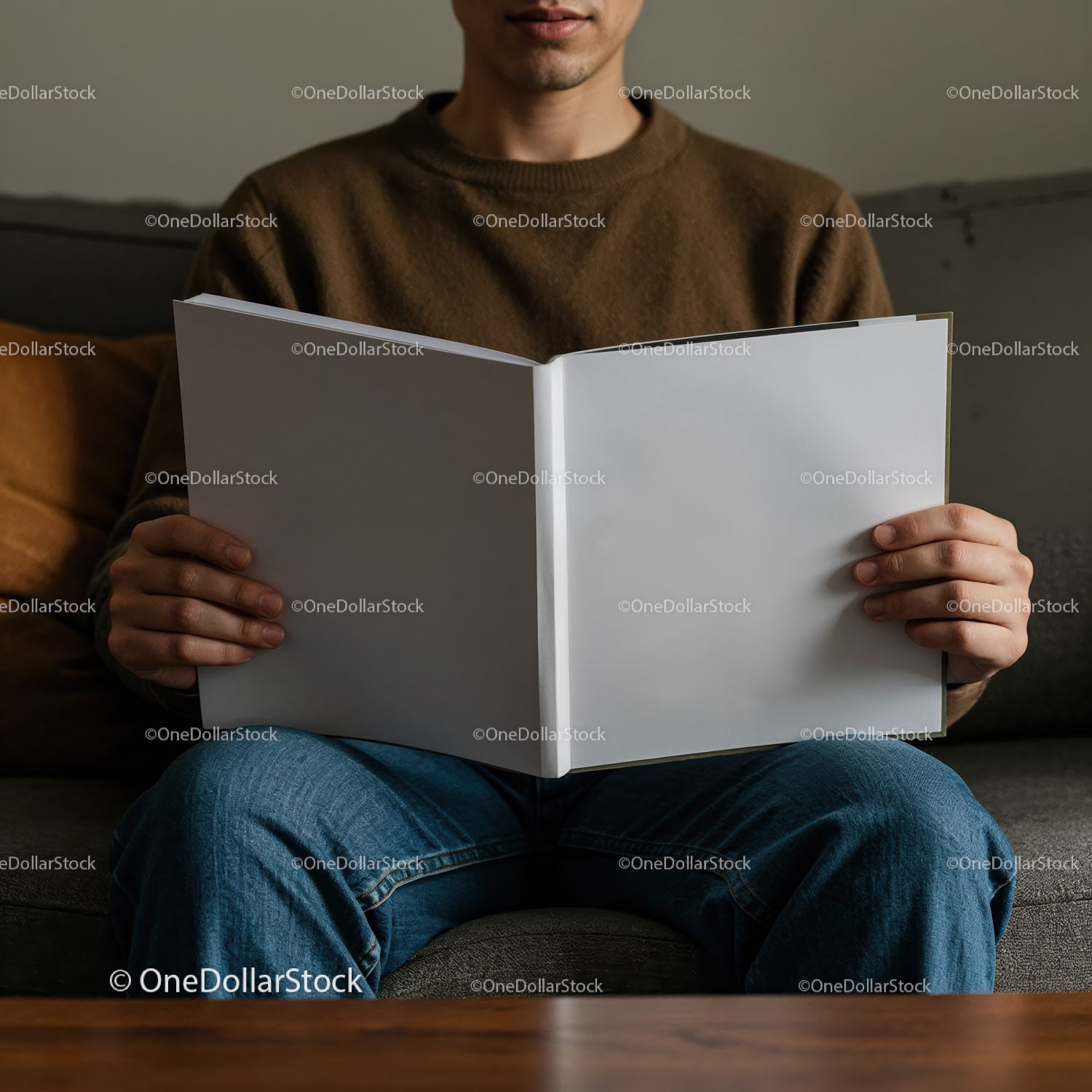 Man Sitting on Couch Holding Blank Open Book