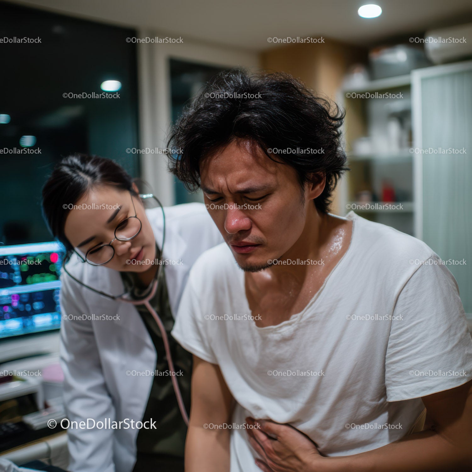 Medical Professional Examining Man Suffering from Stomach Pain in Healthcare Setting
