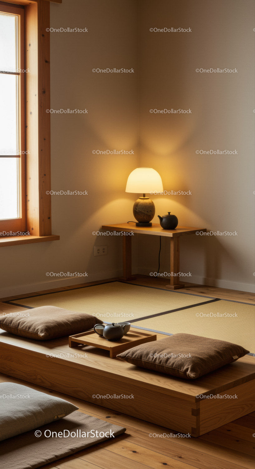 Minimalist Japanese Tea Room with Warm Ambient Lighting