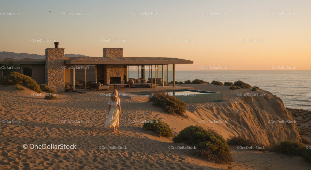 Modern Beach House Overlooking Ocean at Sunset