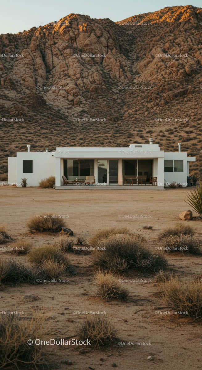 Modern Desert Home with Mountainous Backdrop at Sunset
