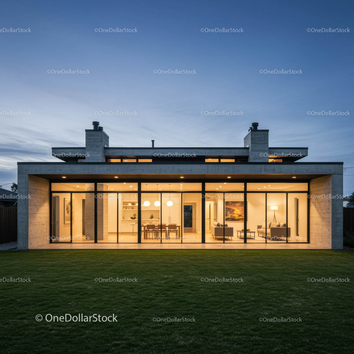 Modern Luxury Home Exterior at Dusk with Large Glass Windows