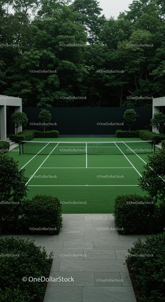A pristine outdoor tennis court nestled within a beautifully landscaped garden, characterized by rich greenery and modern, minimalist design. The lush surroundings offer a serene environment, perfect for a private game or training session. This recreational space seamlessly blends nature with contemporary architecture, creating a tranquil yet stylish ambiance for sports enthusiasts.