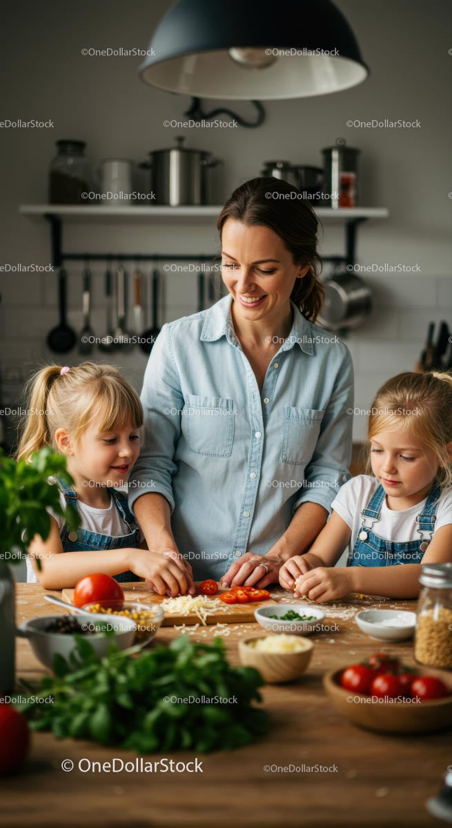 Mother with Daughters Cooking Together in Cozy Kitchen