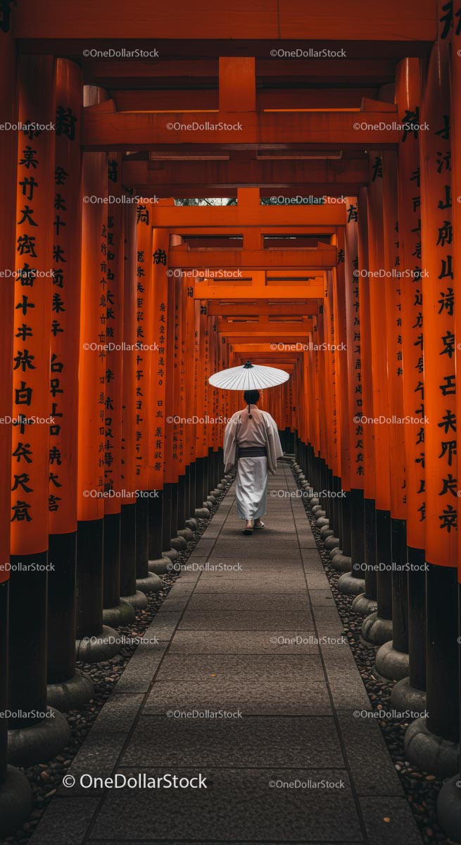 Person Walking through Fushimi Inari's Orange Torii Gates