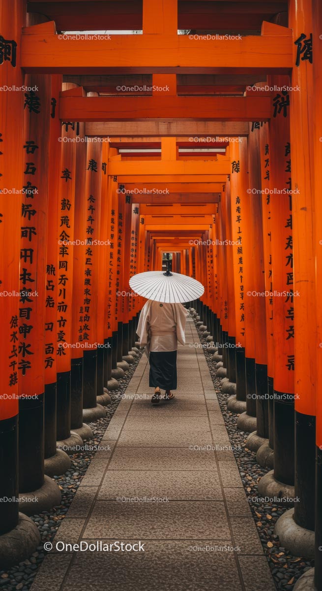 Person Walking Through Iconic Vermilion Torii Gates in Kyoto