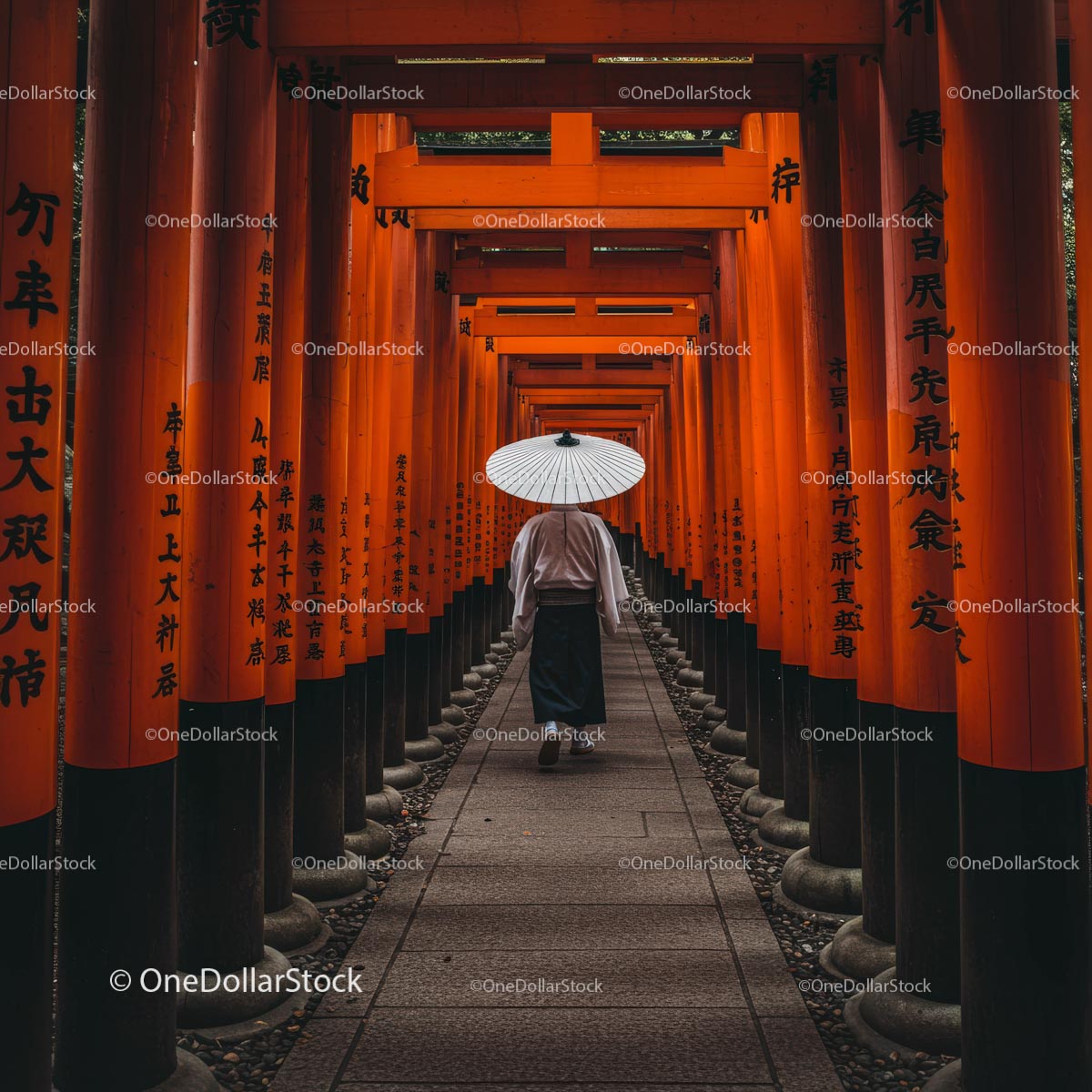 Person with Umbrella Walking Through Torii Gates in Kyoto
