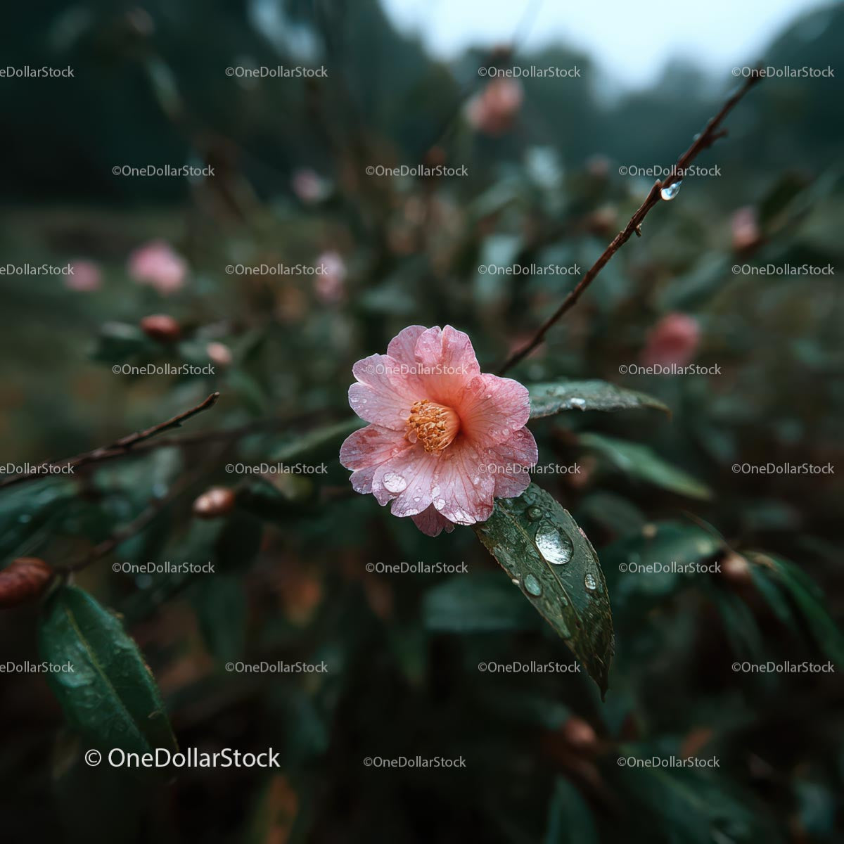 Pink Camellia Blossom with Raindrops in Natural Setting