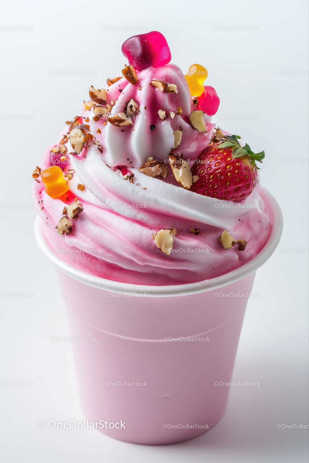 Pink Strawberry Soft Serve Ice Cream with Nuts and Gummy Bears