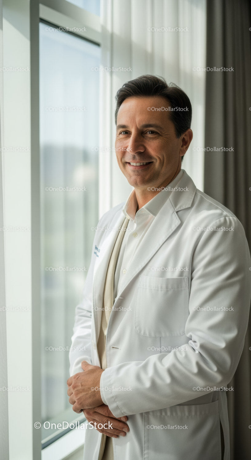Professional Male Doctor in White Coat Standing Near Window in Hospital