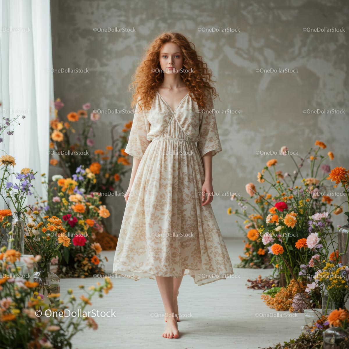 Redhead Woman in Floral Dress Surrounded by Wildflowers