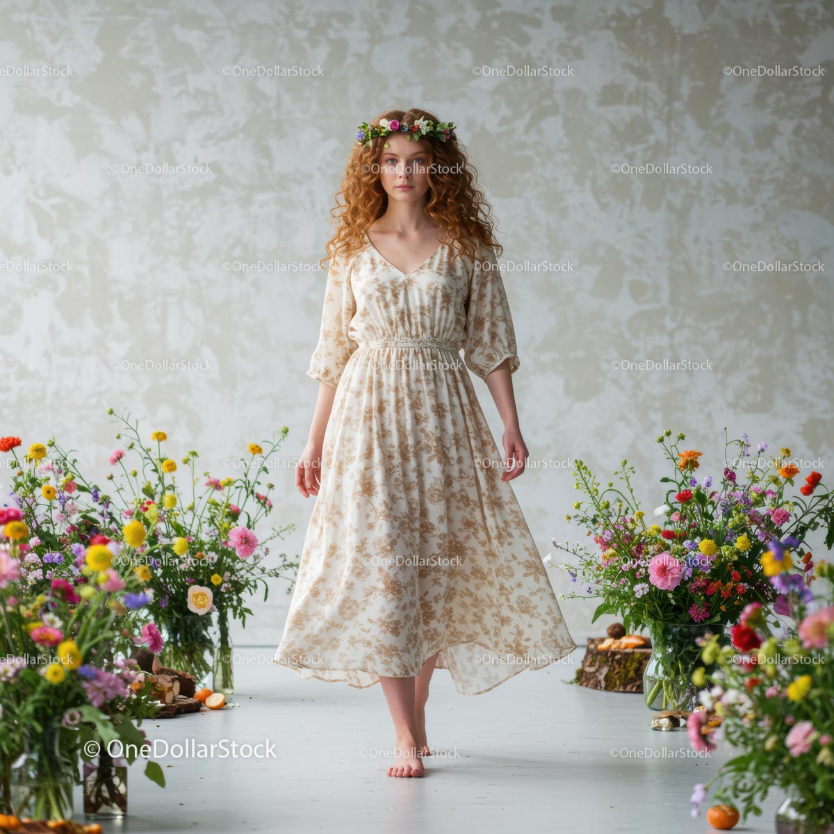 Redhead Woman in Floral Dress with Flower Crown in Blooming Setting