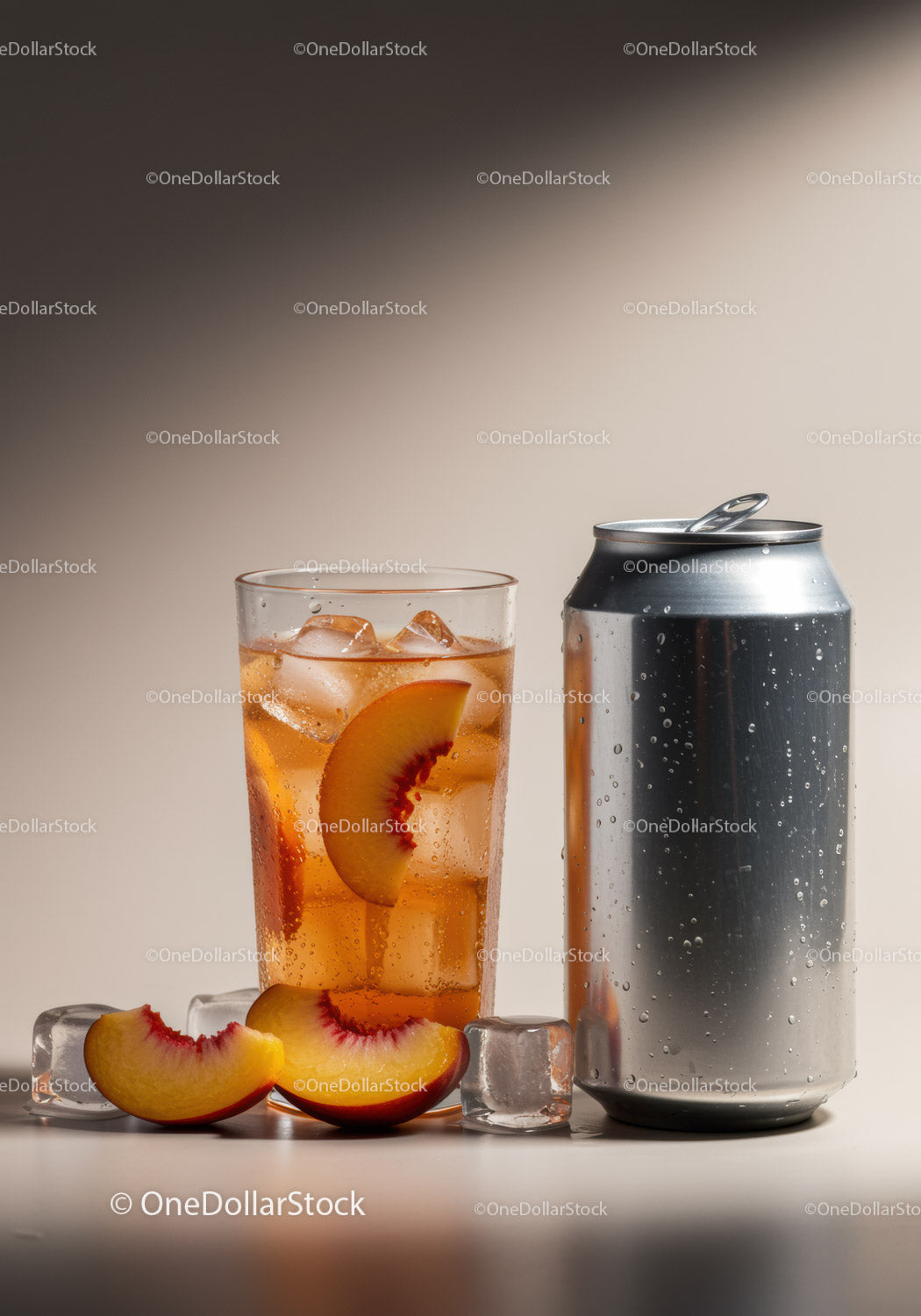Refreshing Peach Iced Drink with Silver Can and Ice Cubes