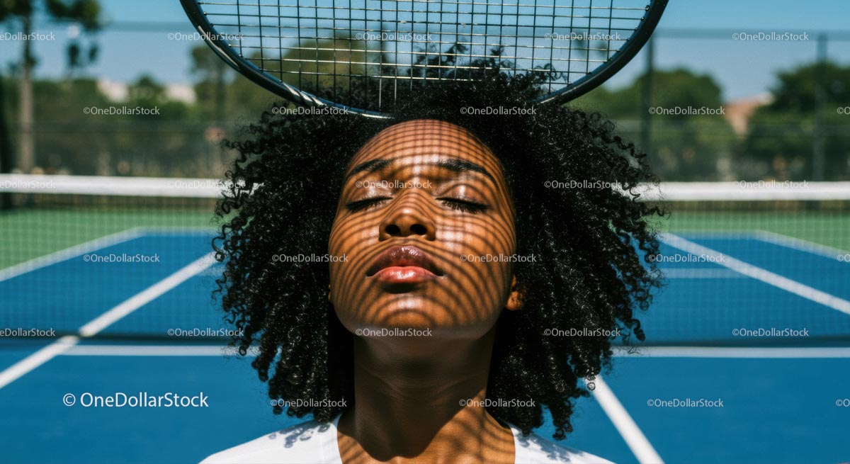 A woman with curly hair embraces the warmth of the sun on a tennis court. Her face is artistically patterned with shadows created by a tennis racket, capturing a moment of peaceful leisure. The vibrant blue of the court and the lush green surroundings highlight the serene outdoor setting, emphasizing a lifestyle focused on sports and wellness.