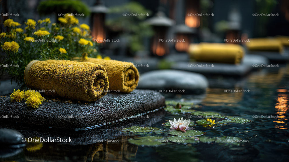 Relaxing Outdoor Spa Scene with Towels and Lotus Flowers