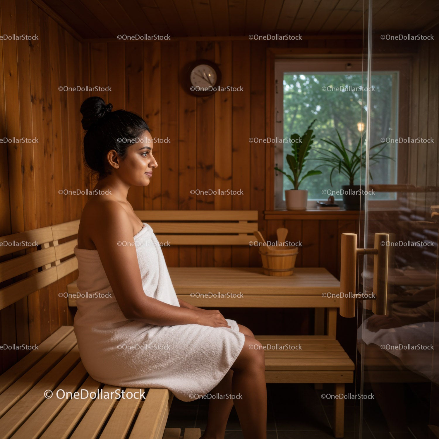 Relaxing Woman Sitting in Wooden Sauna Room with Potted Plants