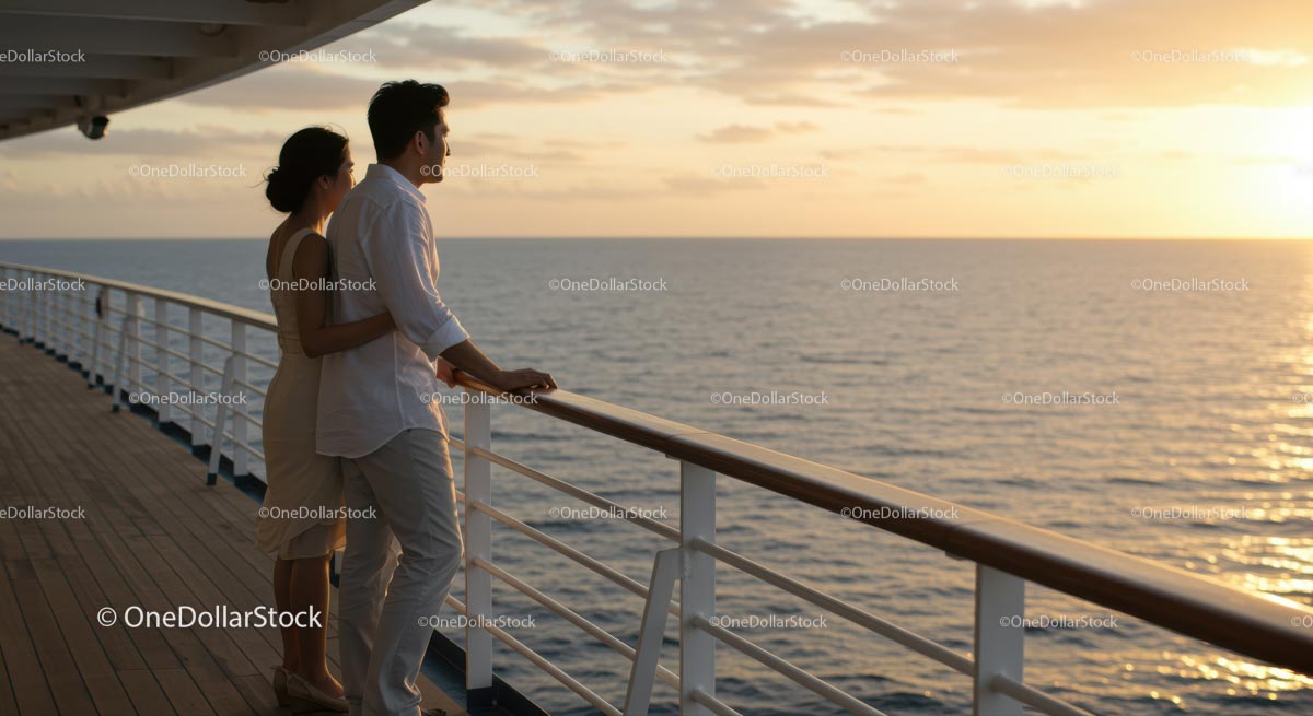 Romantic Couple Enjoying Sunset on Cruise Ship