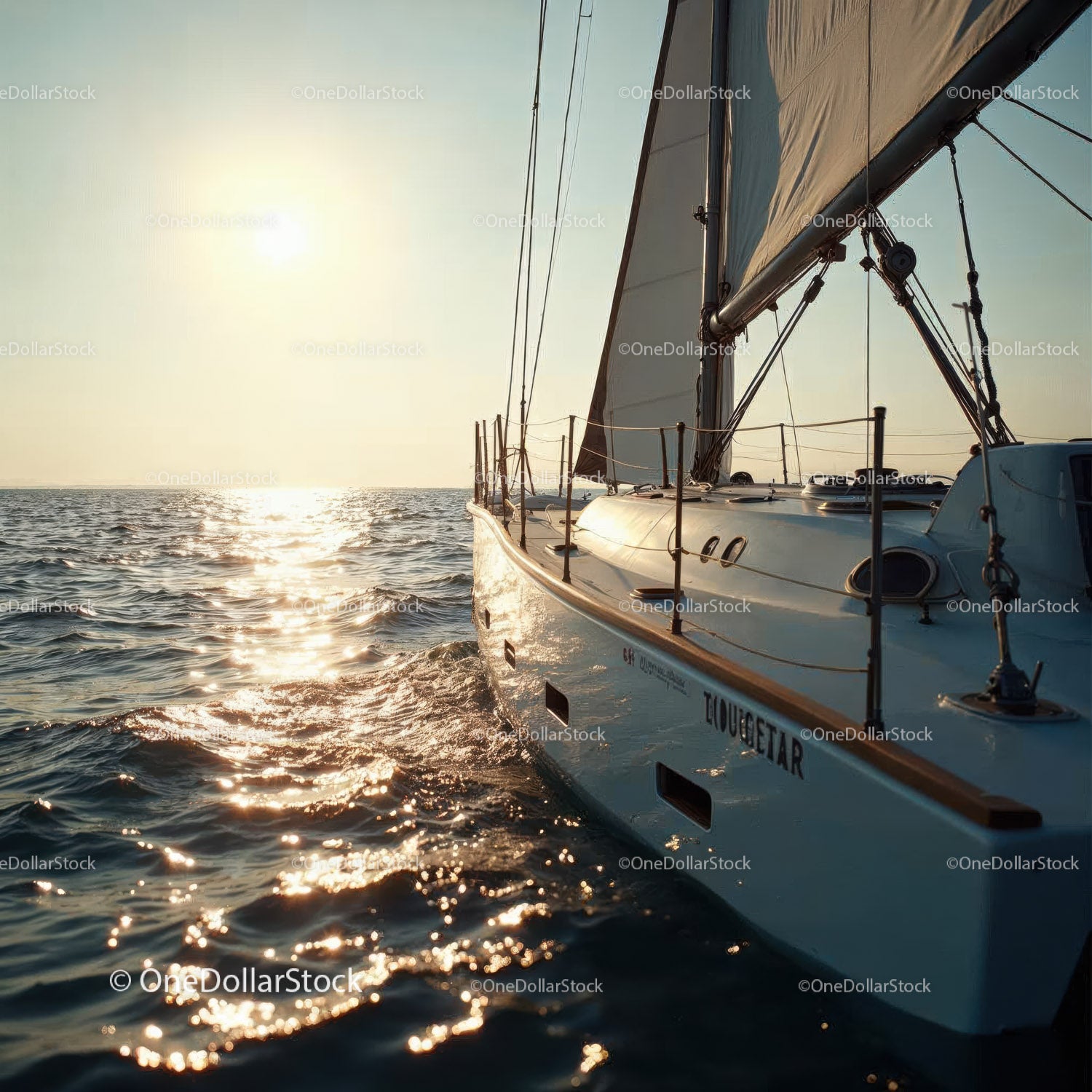 Sailing Yacht on Open Ocean at Sunset with Bright Sun