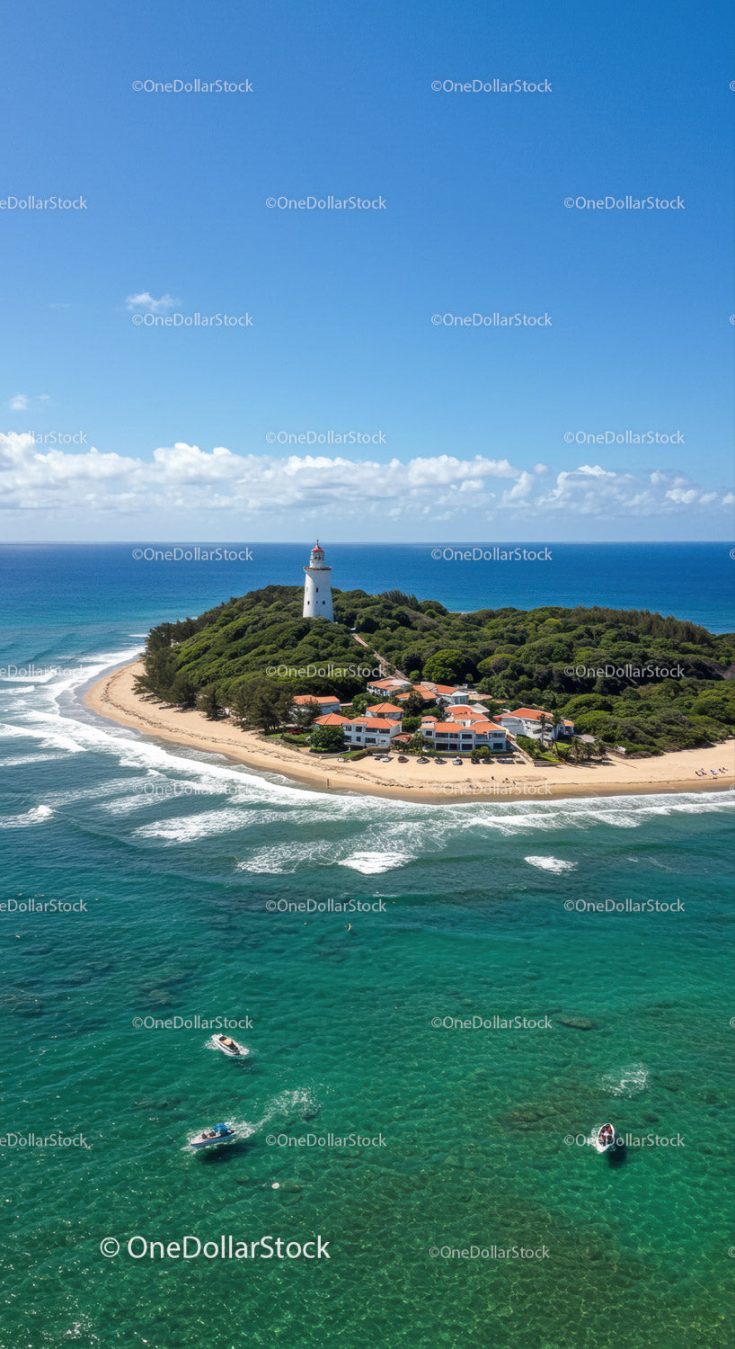 Scenic Coastal Island with Lighthouse and Boats Under Blue Sky