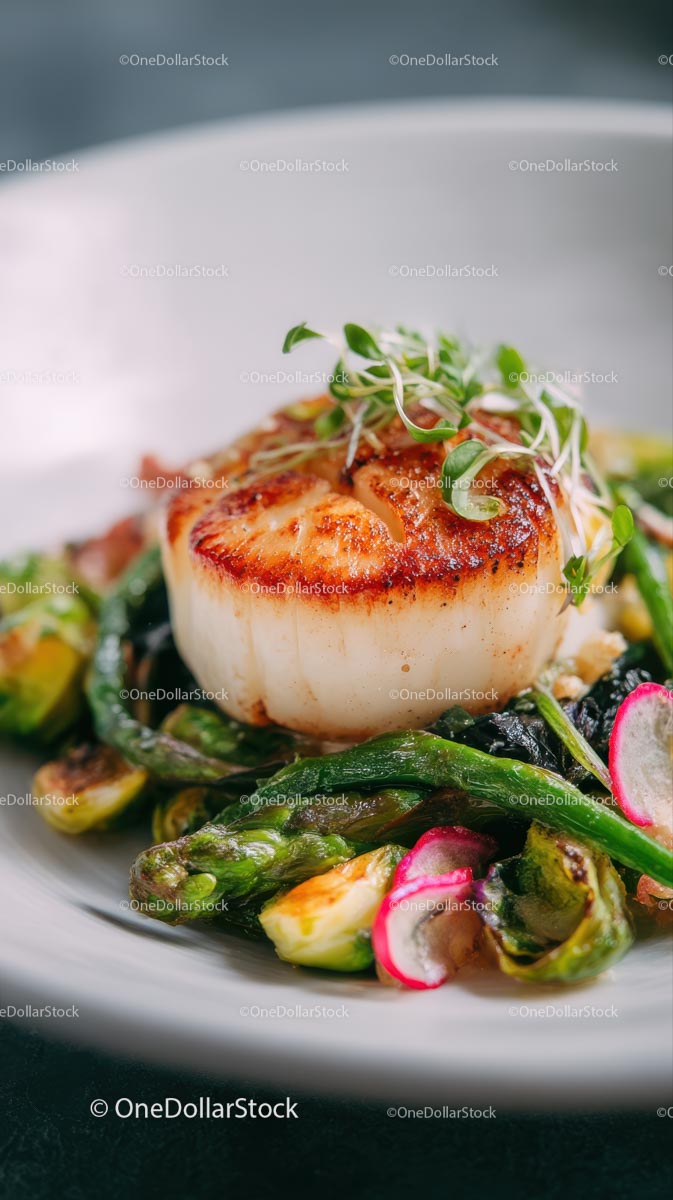 Seared Scallop on Asparagus and Roasted Vegetables
