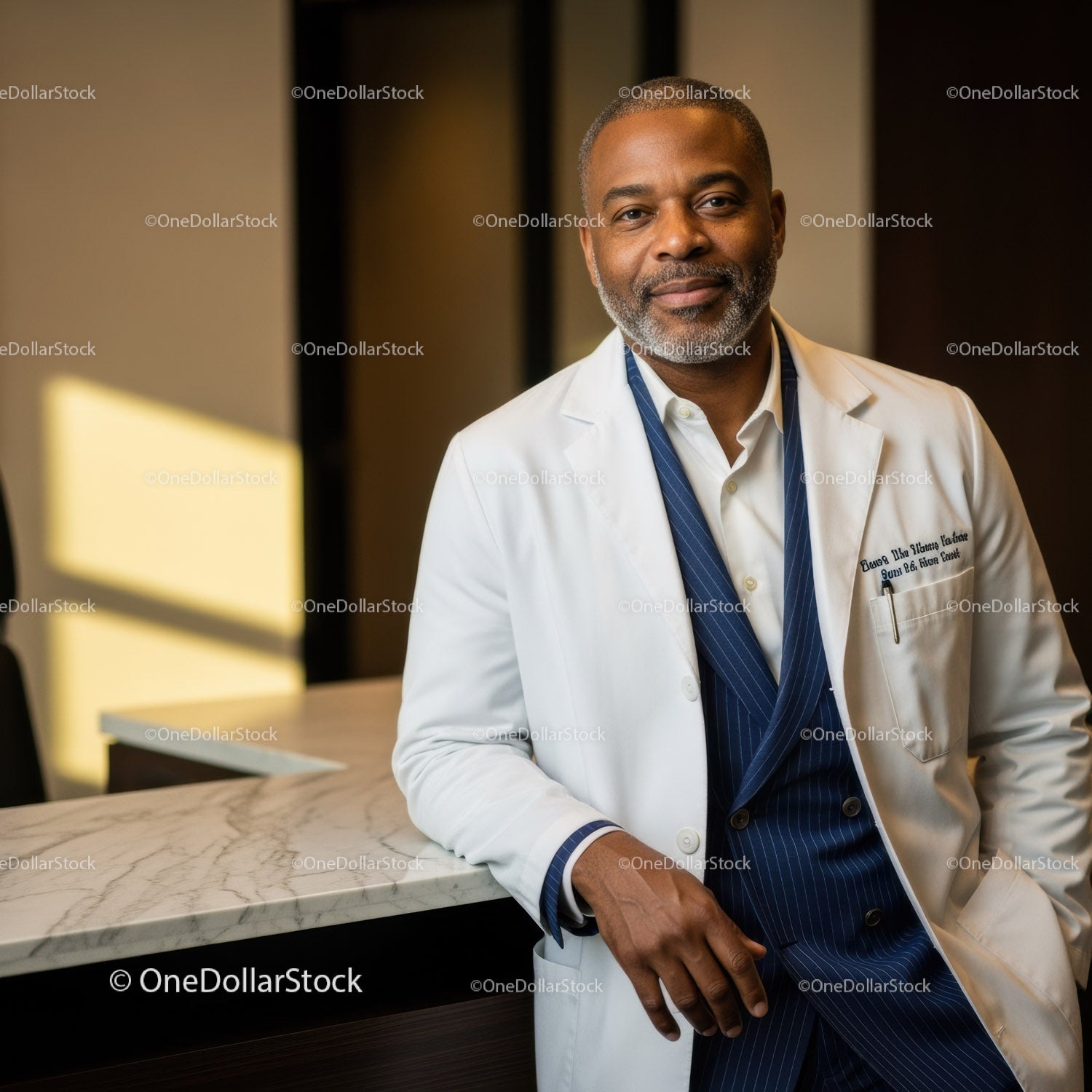 Senior African American Male Doctor Wearing White Lab Coat and Blue Suit in Clinic