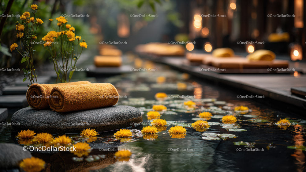 Serene Spa Water Fountain with Lotus Blossoms and Rolled Towels