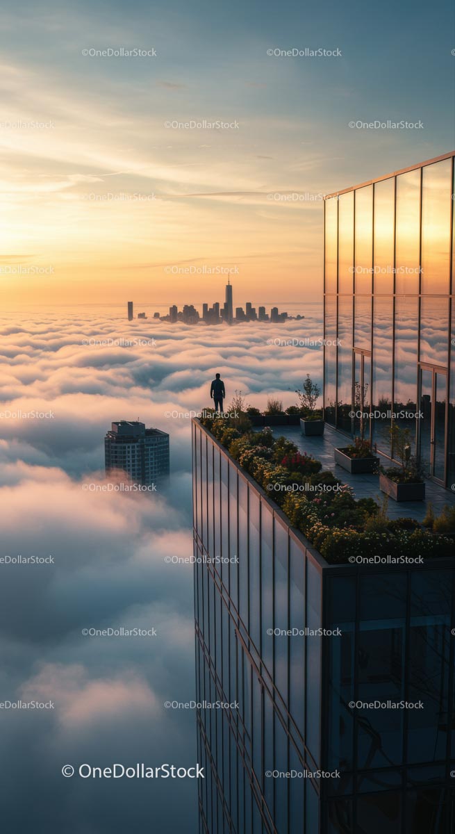 Silhouette on Rooftop Garden Above City Skyline at Sunset