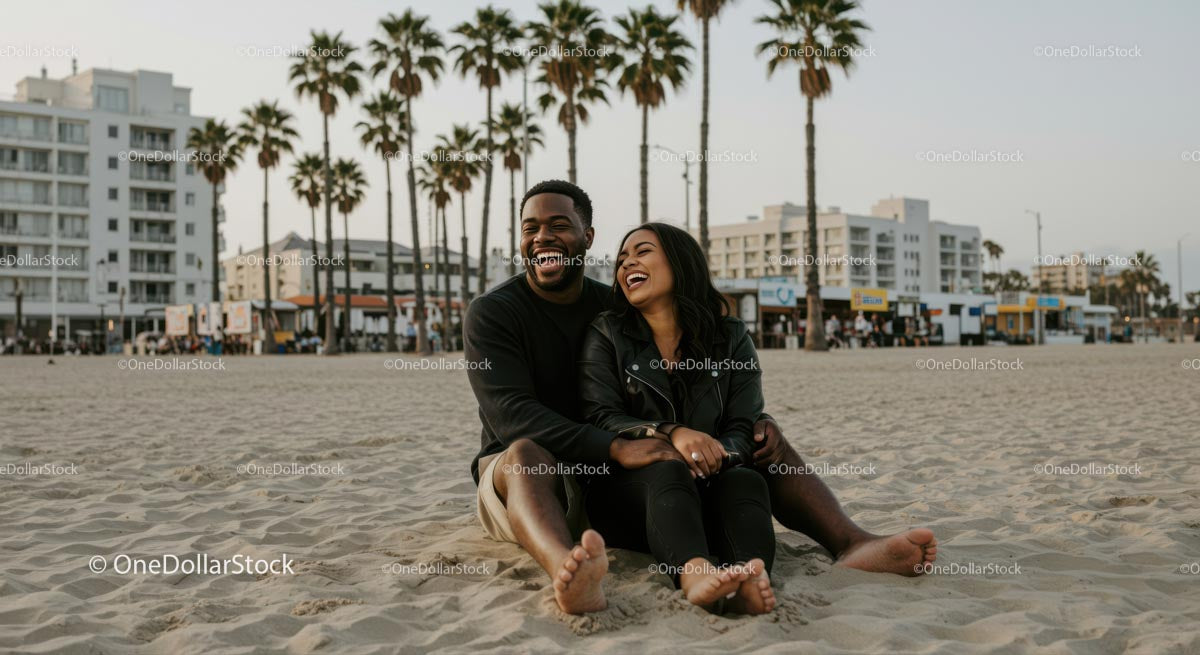 Smiling Couple Relaxing on a Sandy Beach with Palm Trees