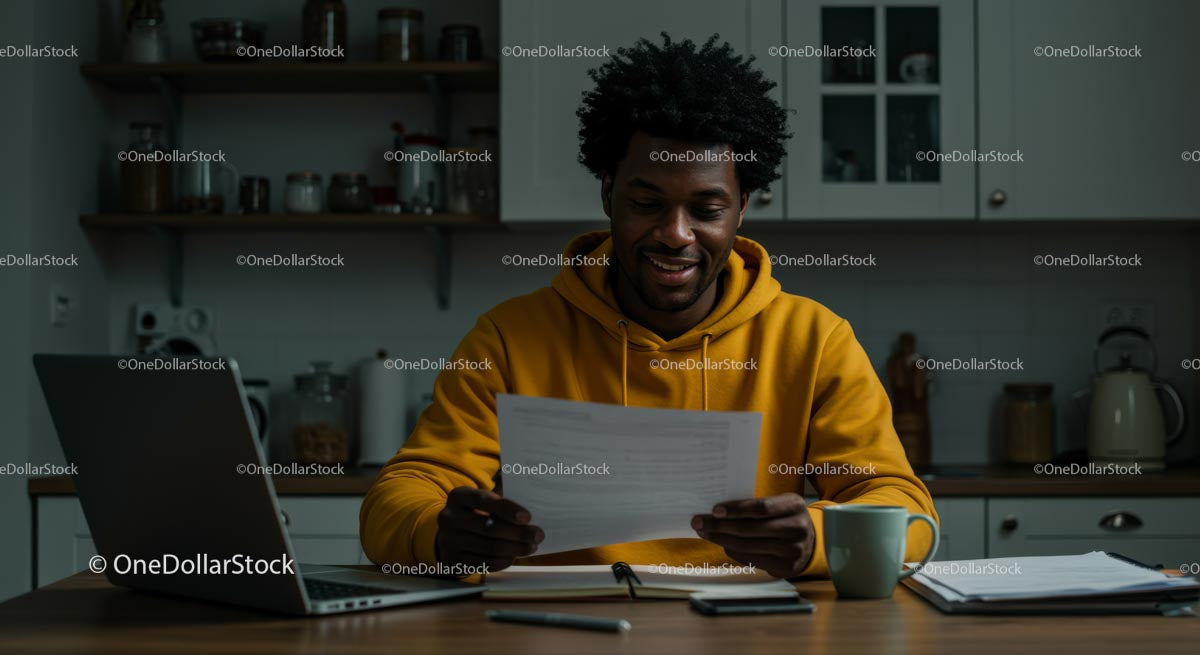 Smiling Man in Yellow Hoodie Reading Letter at Home Desk