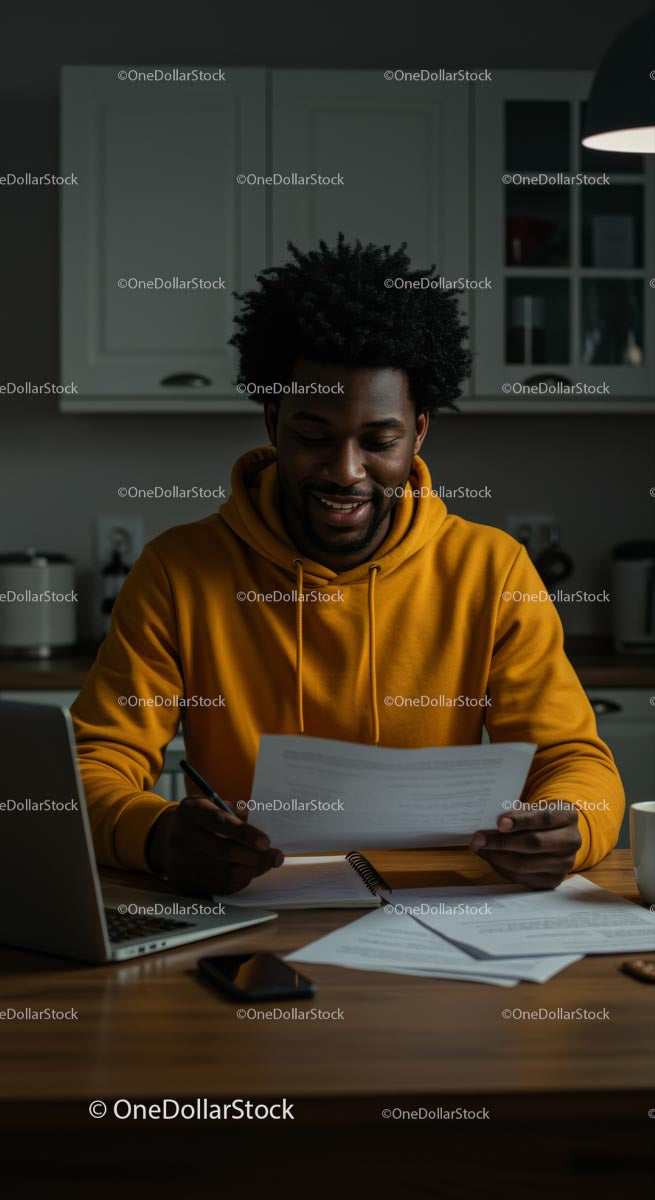 Smiling Man in Yellow Hoodie Reads Documents at Home