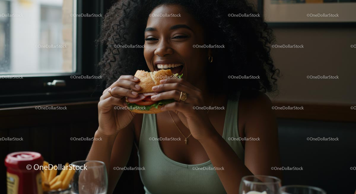 Smiling Woman Enjoying a Delicious Burger in Restaurant