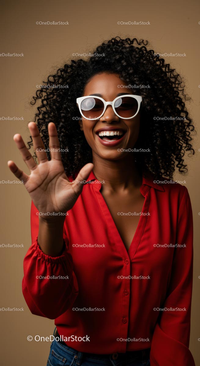 Smiling Woman in Red Blouse and Sunglasses, Waving