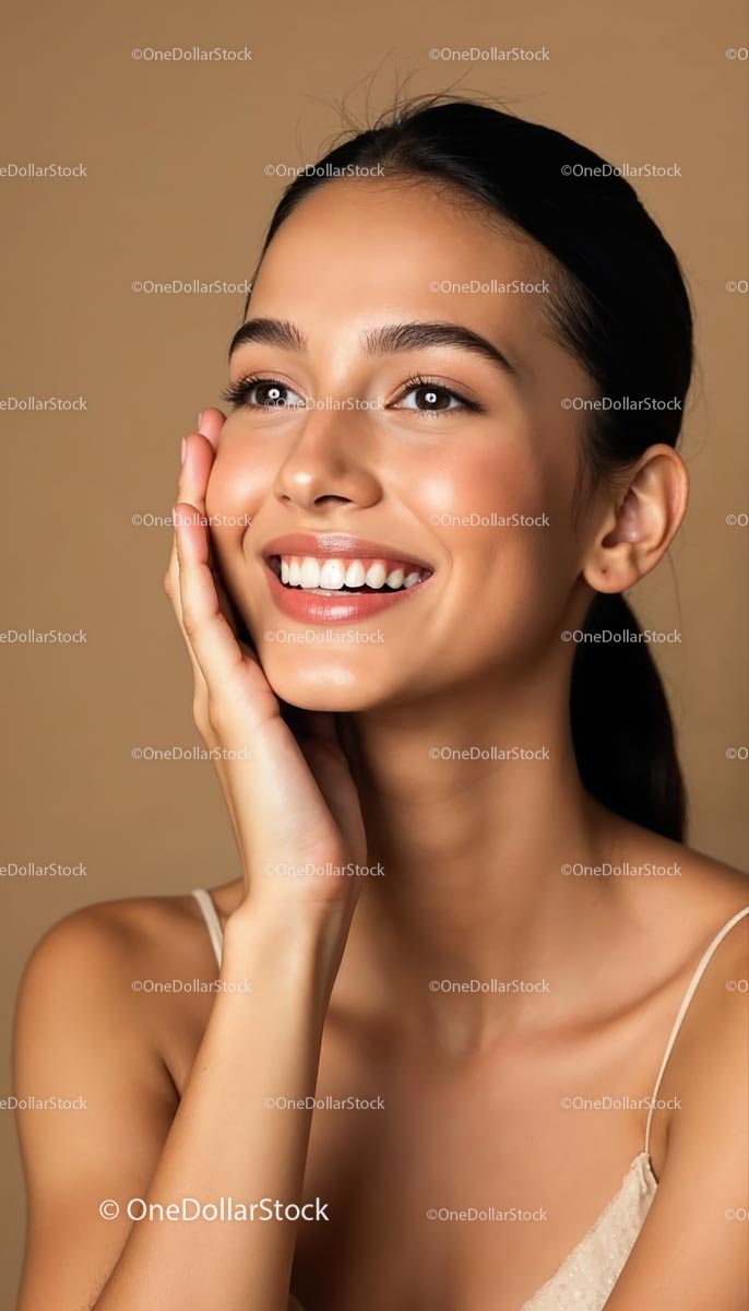 Smiling Woman with Radiant Skin on Brown Background