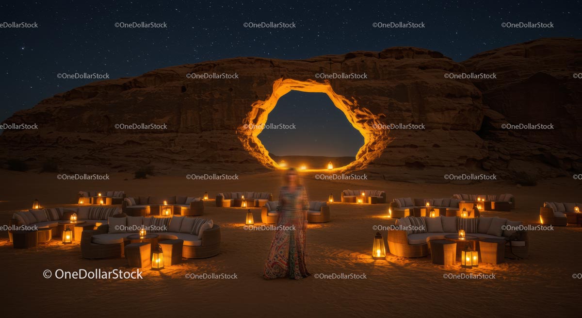 Starlit Desert Oasis with Lantern-Lit Seating and Arch