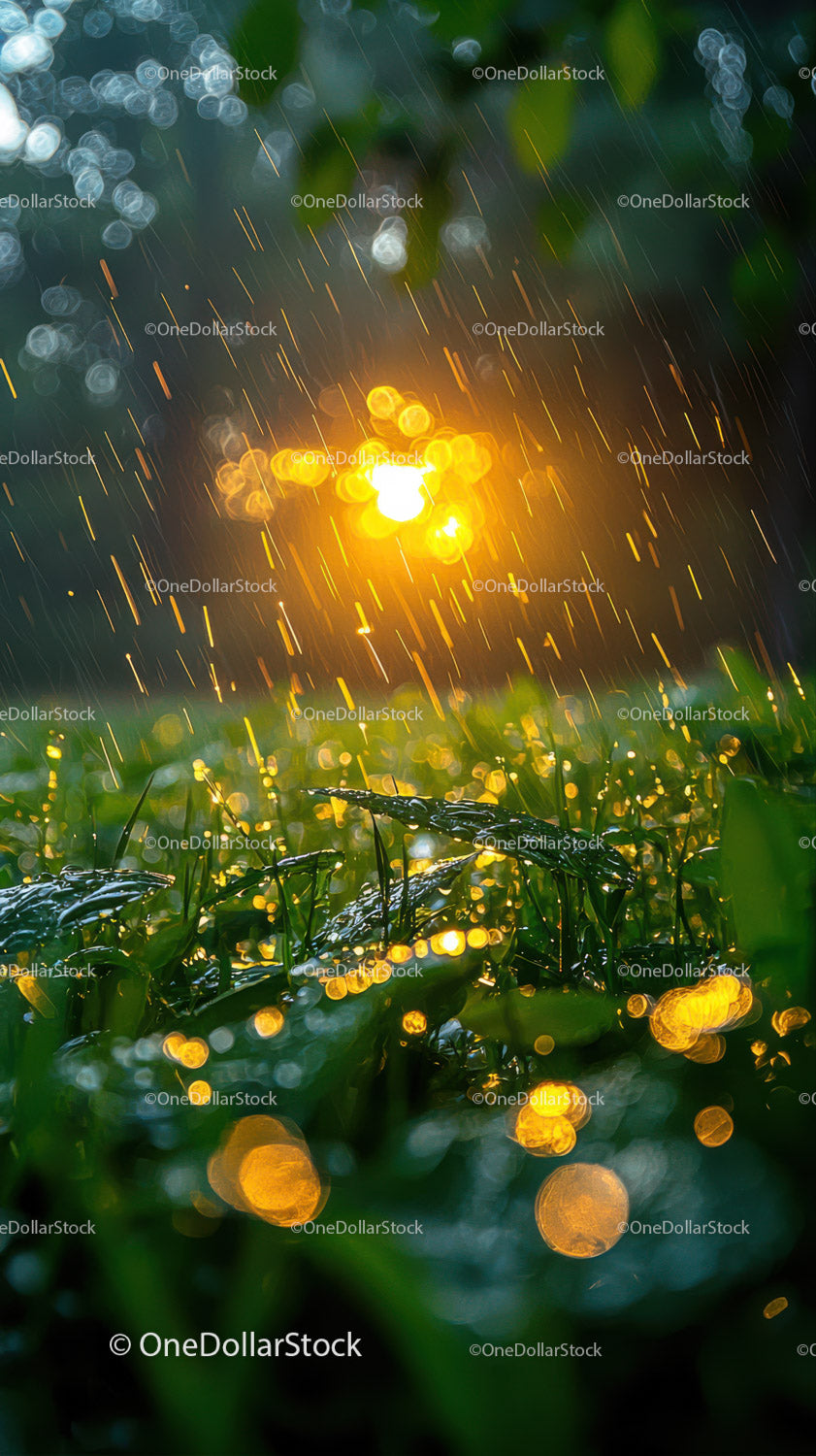 Sunlight Piercing Raindrops on Green Foliage in Nature