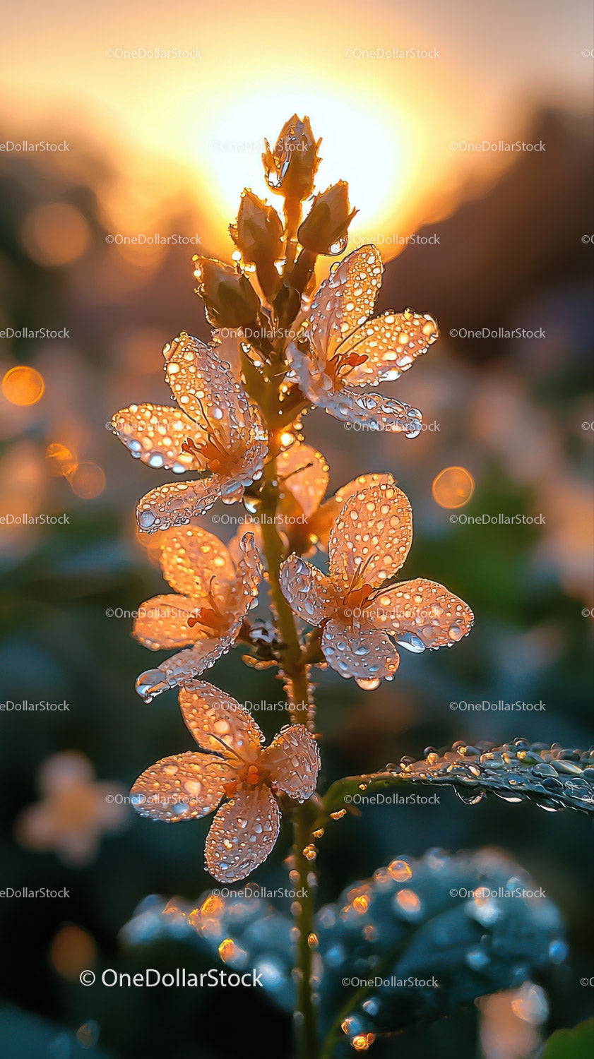 Sunrise Blooming Flower with Dew Drops in Stunning Backlit Scene