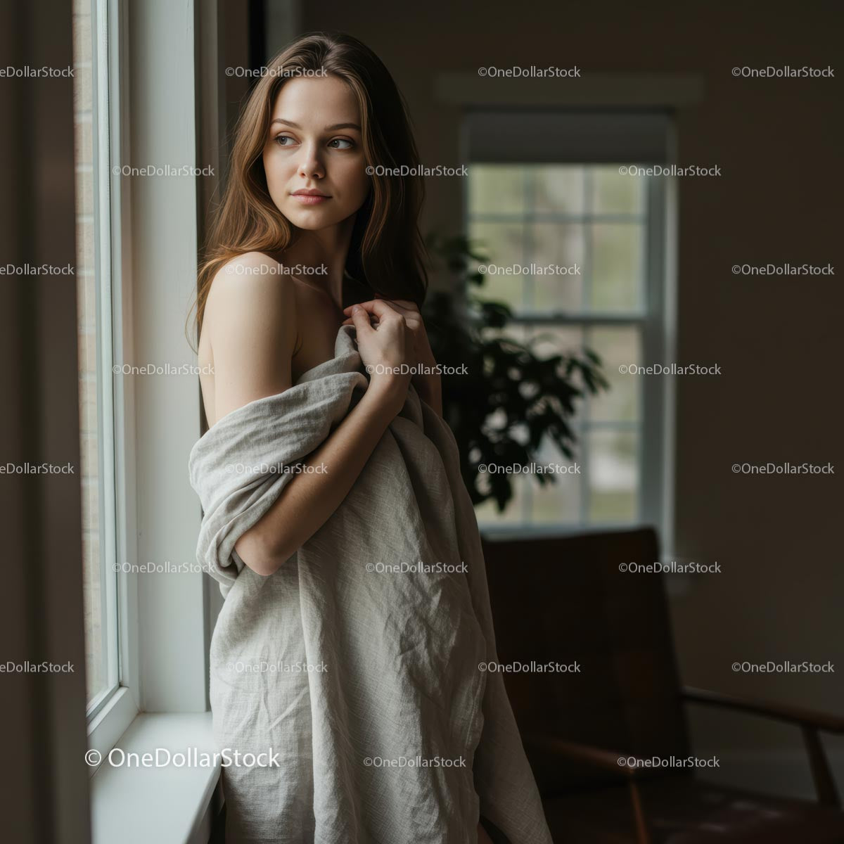 Thoughtful Woman Wrapped in Blanket by Window