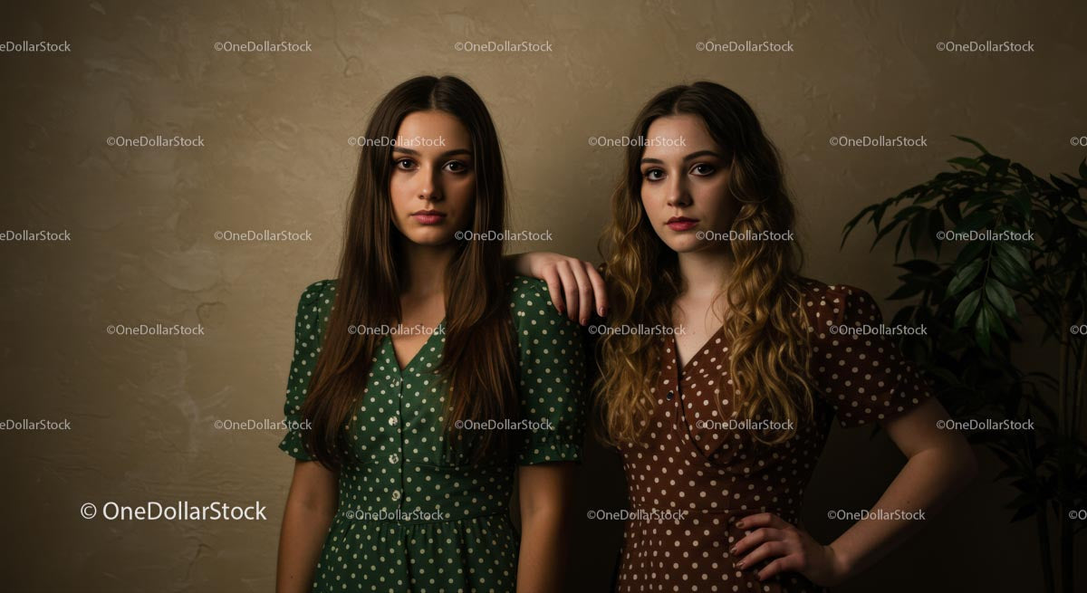 Two Women in Vintage Polka Dot Dresses Standing Confidently