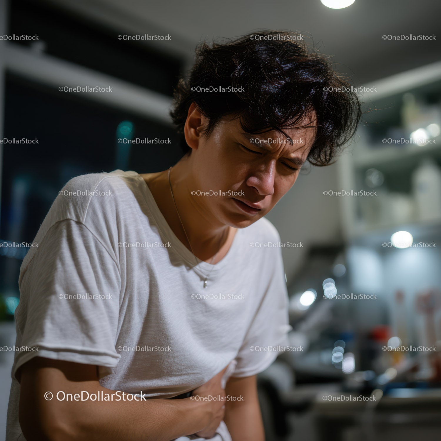 Upset Woman Experiencing Stomach Pain in Casual Indoor Setting