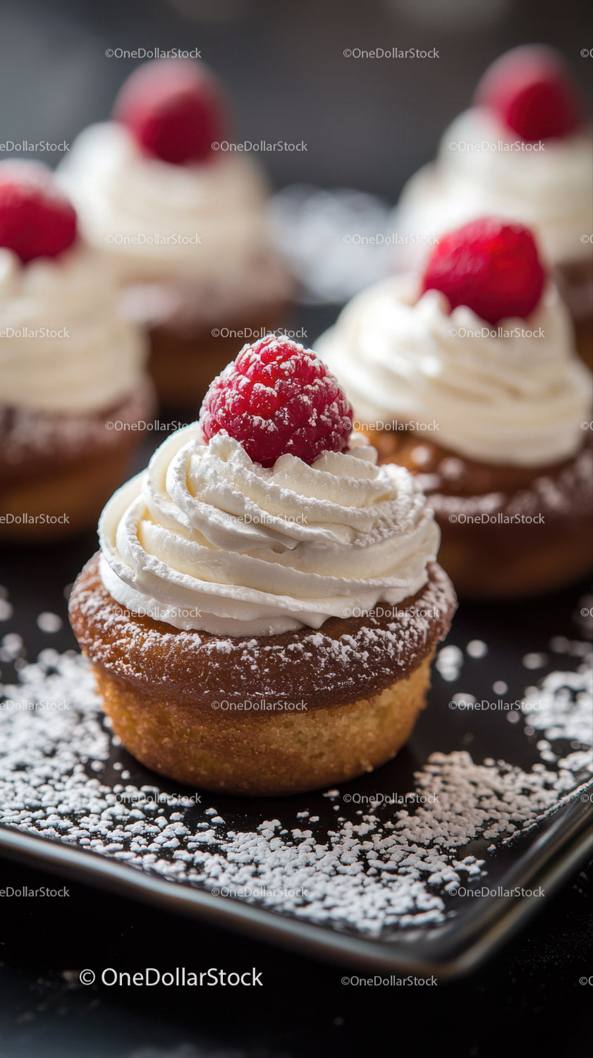 Vanilla Cupcake with Raspberry Topping on Black Serving Plate (32 Images)