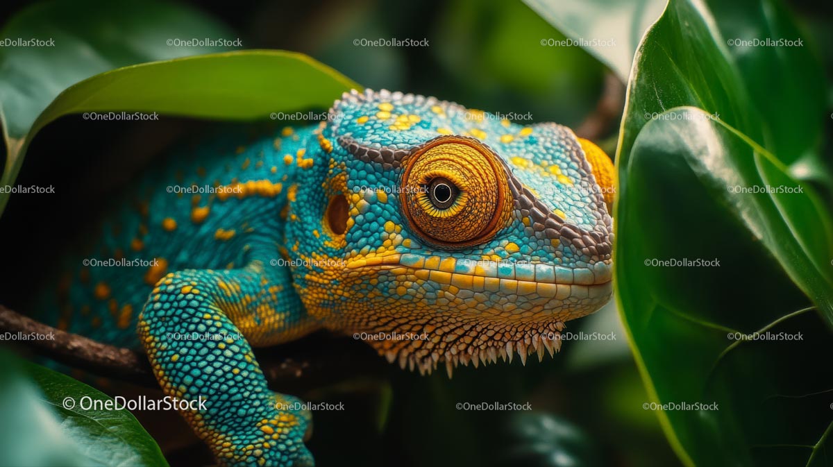 Vibrant Chameleon Among Lush Green Leaves in Jungle