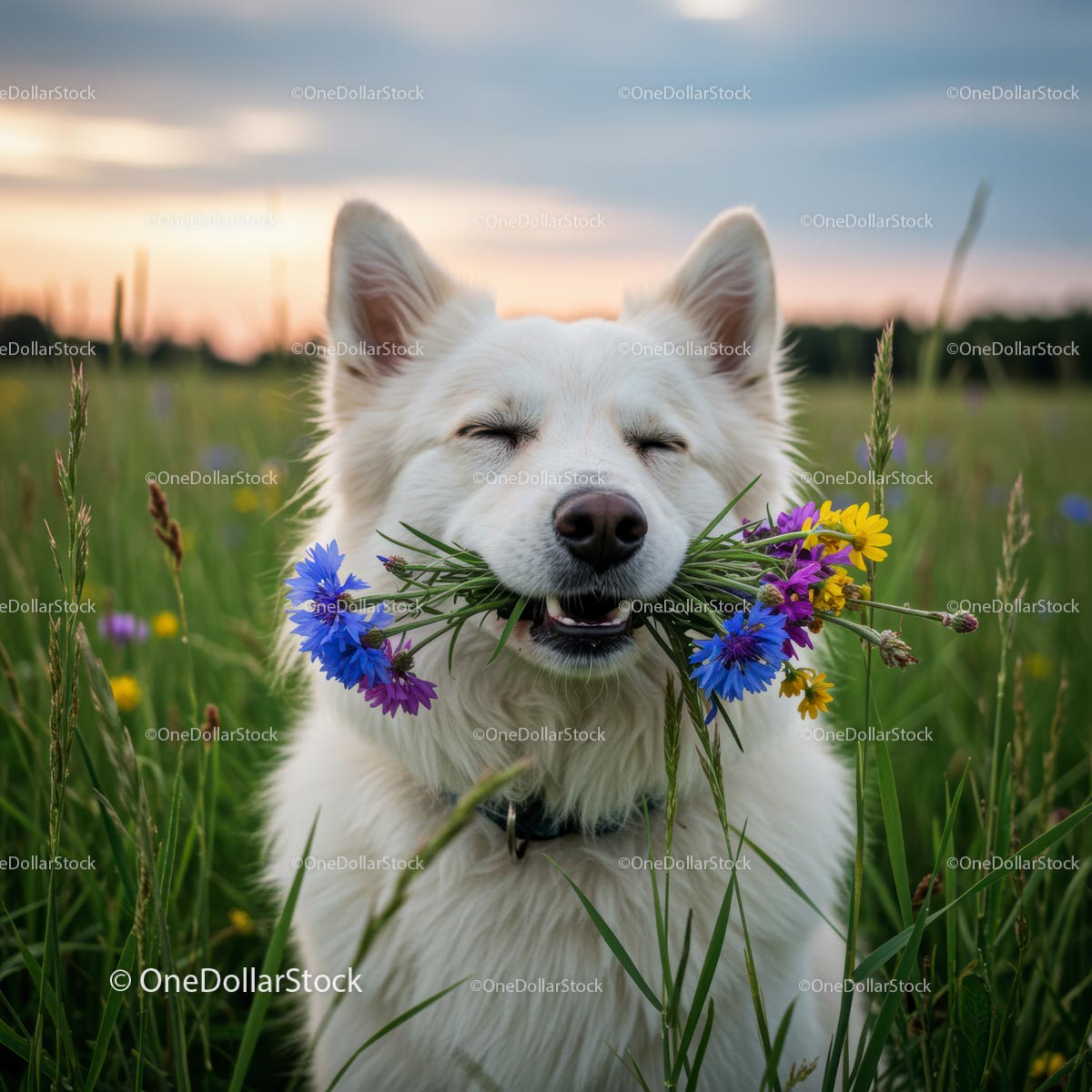White Dog Holding Colorful Wildflowers in a Green Meadow