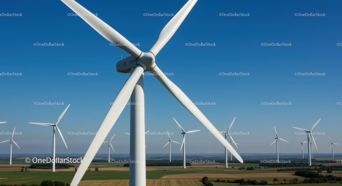 Wind Turbines in Green Fields Under Clear Blue Sky