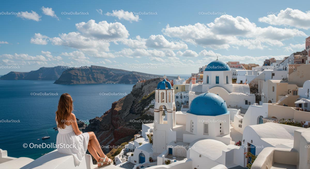Woman Admiring Santorini's Iconic Blue Domes and Sea View