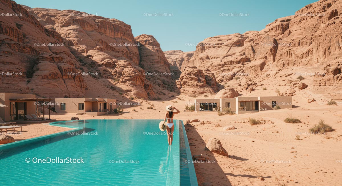 Woman Enjoying Infinity Pool Amidst Desert Mountains