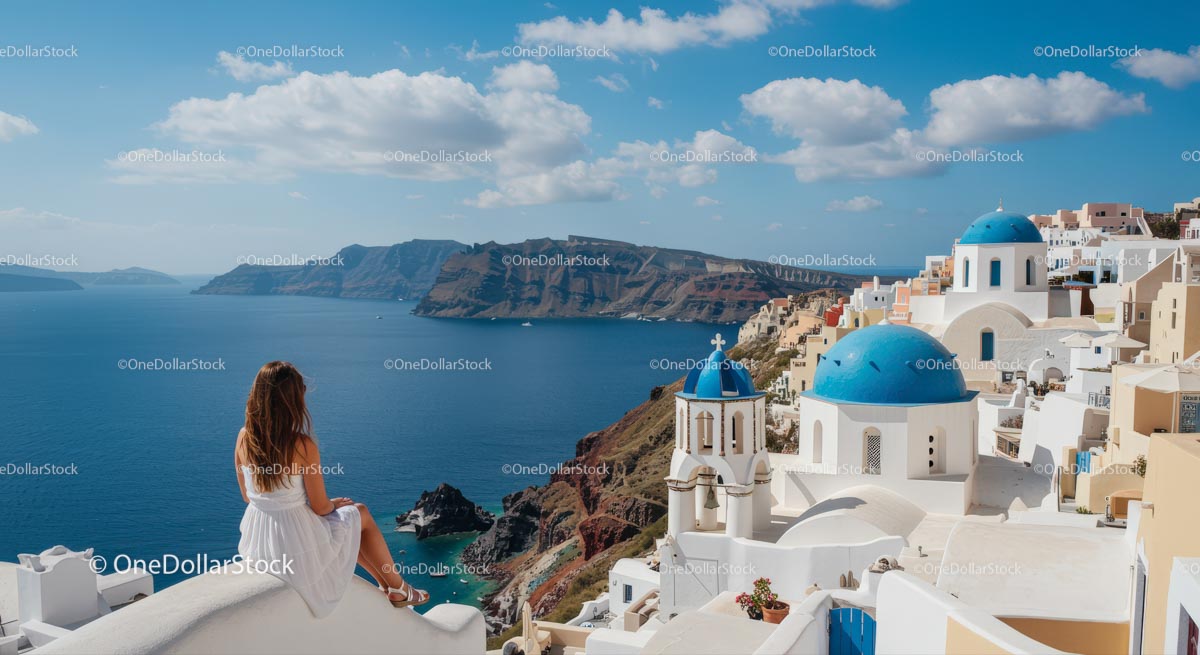 Woman Enjoying Scenic View of Santorini's Iconic Blue Domes