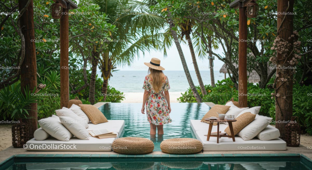 Woman in Floral Dress Enjoying Tropical Infinity Pool