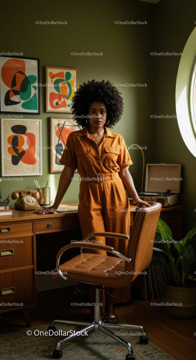 Woman in Retro Office with Afro Hairstyle and Orange Jumpsuit