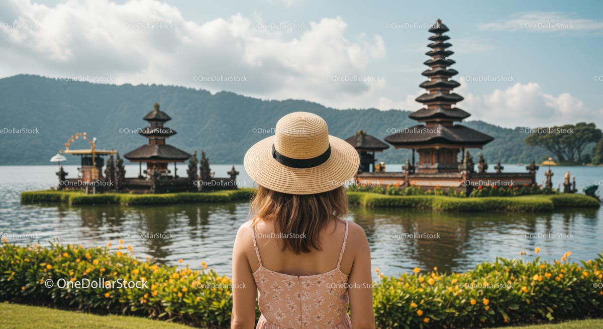 Woman in Summer Hat Facing Beautiful Balinese Temple