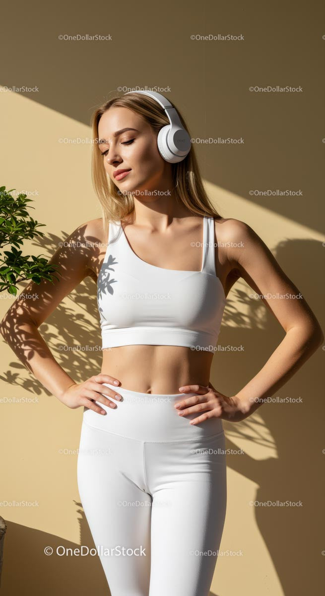 Woman in White, Yellow, Brown or Green Activewear Relaxing with Headphones (19 Images)